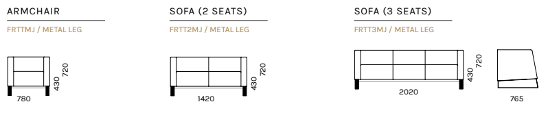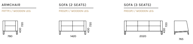 The armchair and compact sofa feature legs crafted from natural oak, showcasing a beautifully executed dowel joint that not only reinforces the structure but also highlights the craftsmanship and quality of the design. For a more contemporary look, the collection is also available with elegantly shaped metal legs, offering a sleek alternative that complements modern interiors.