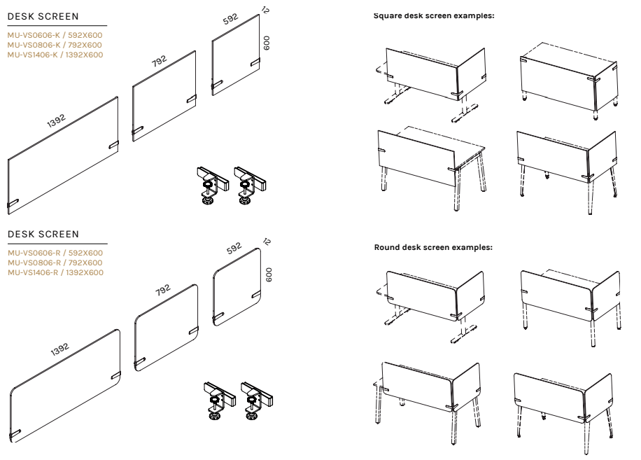 In addition, the spring clips allow changing the placement of the screens and adjusting the heights every millimeter without damaging the surface of the screen. There is an adjustable gap between the screen and the tabletop, which allows to pass the wires under the table over the edge of the table. The tabletop or metal frame to which the screen is attached can have a wide thickness range (13-52 mm).