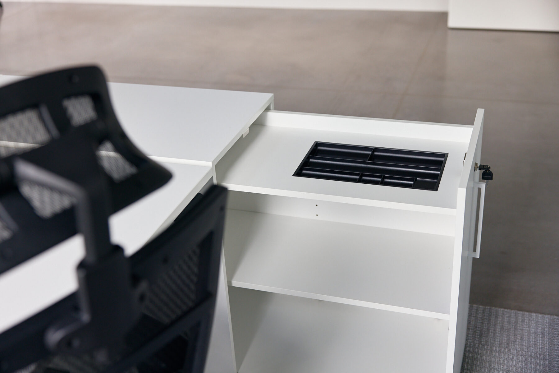 PIANO container cabinet is a larger storage solution, suitable for use with both fixed and adjustable desks. It comes with an integrated pencil tray and optional drawer unit inside. Container cabinet can be locked either with a standard key lock or a digital combination lock. Both lock types can be ordered with a master key option for administrative access.
