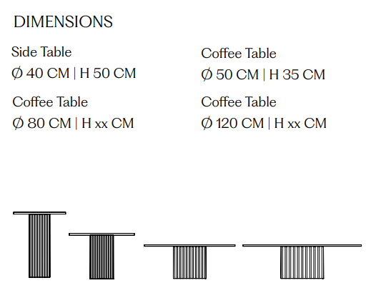 Diivanilauda on võimalik tellida kahes erinevas suuruses – diameetriga 50 cm (kõrgus 35 cm) ning diameetriga 40 cm (kõrgus 50 cm).